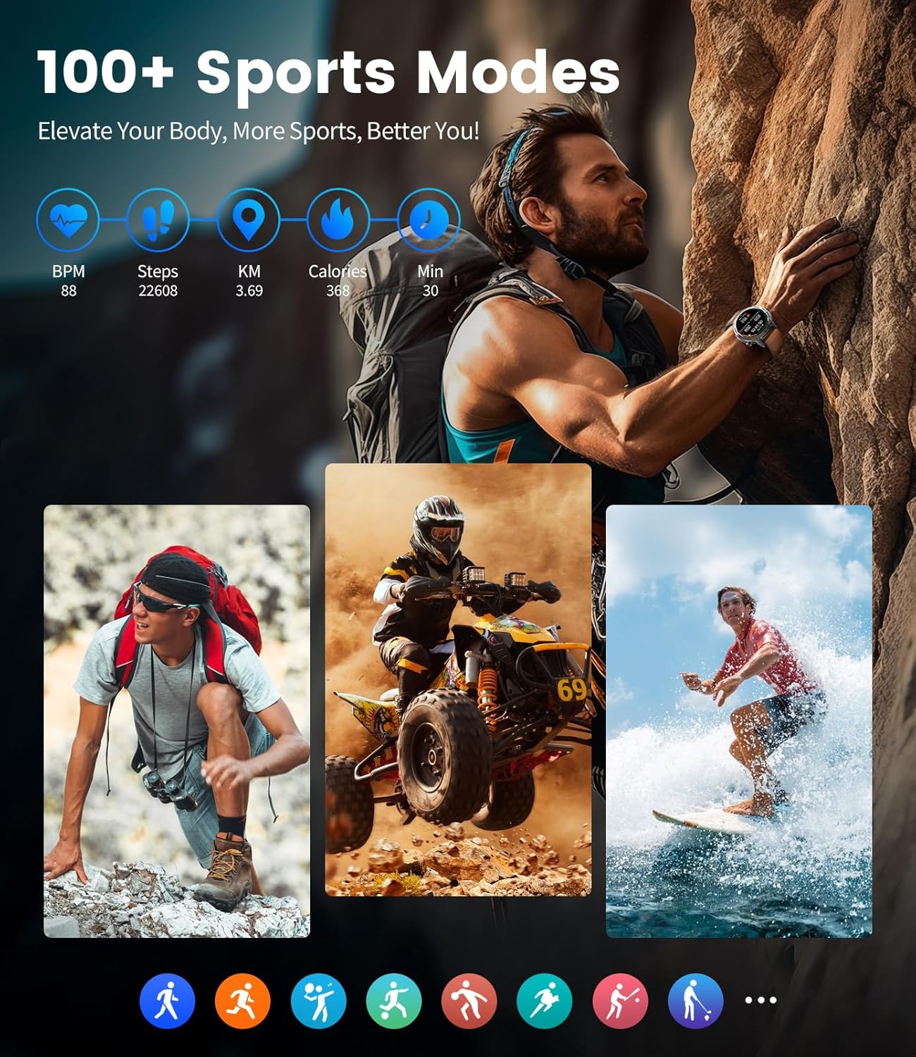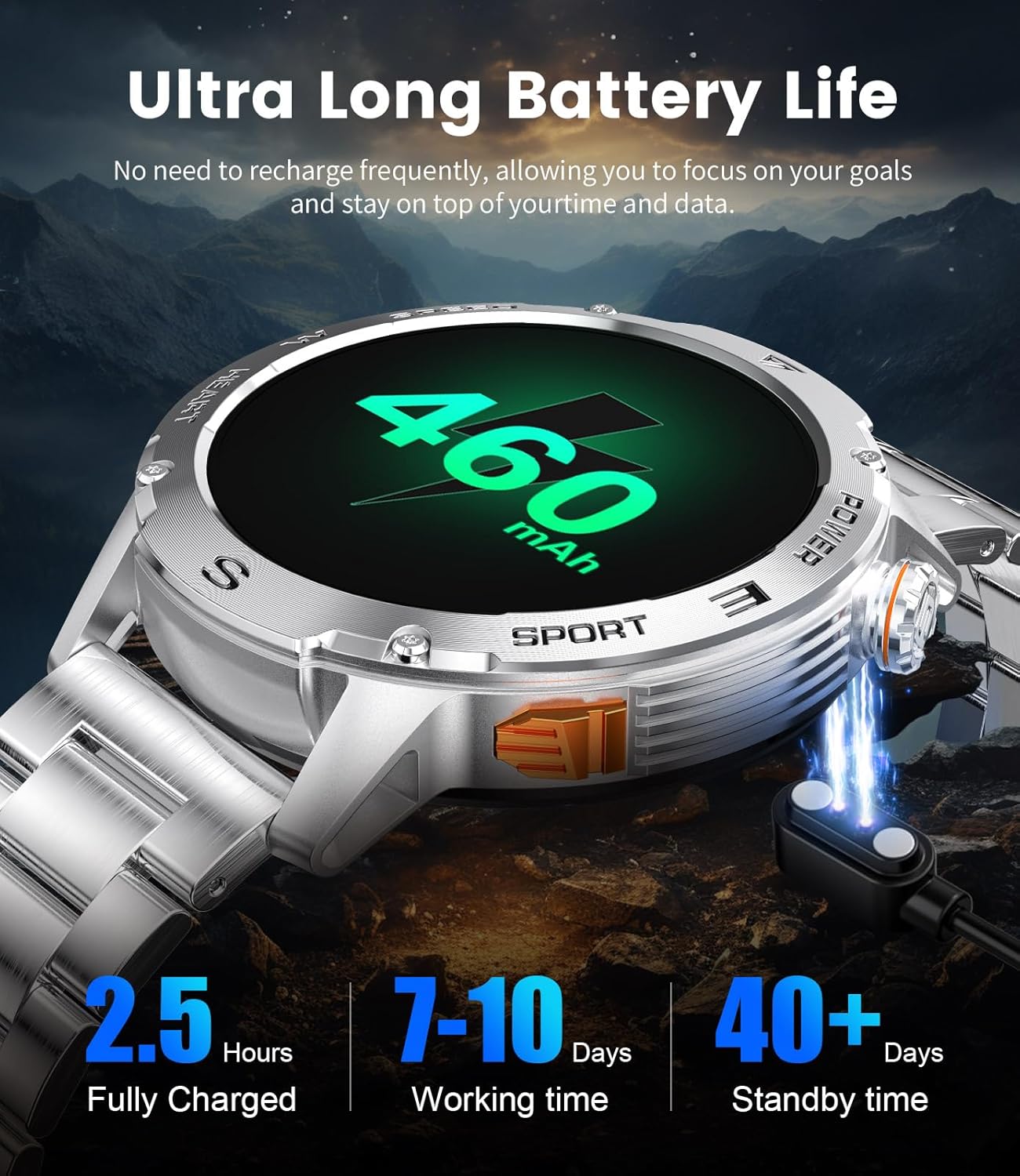 - 【460mAh High Capacity Battery And 5ATM Waterproof】This military smart watches for men uses corrosion-resistant 304 stainless steel case and band, and fully enclosed 5ATM waterproof design guarantee reliability in the face of extreme environments. With a sizable 460mAh battery, it offers an impressive 5-10 days of usage and an extended battery life of up to 30 days.